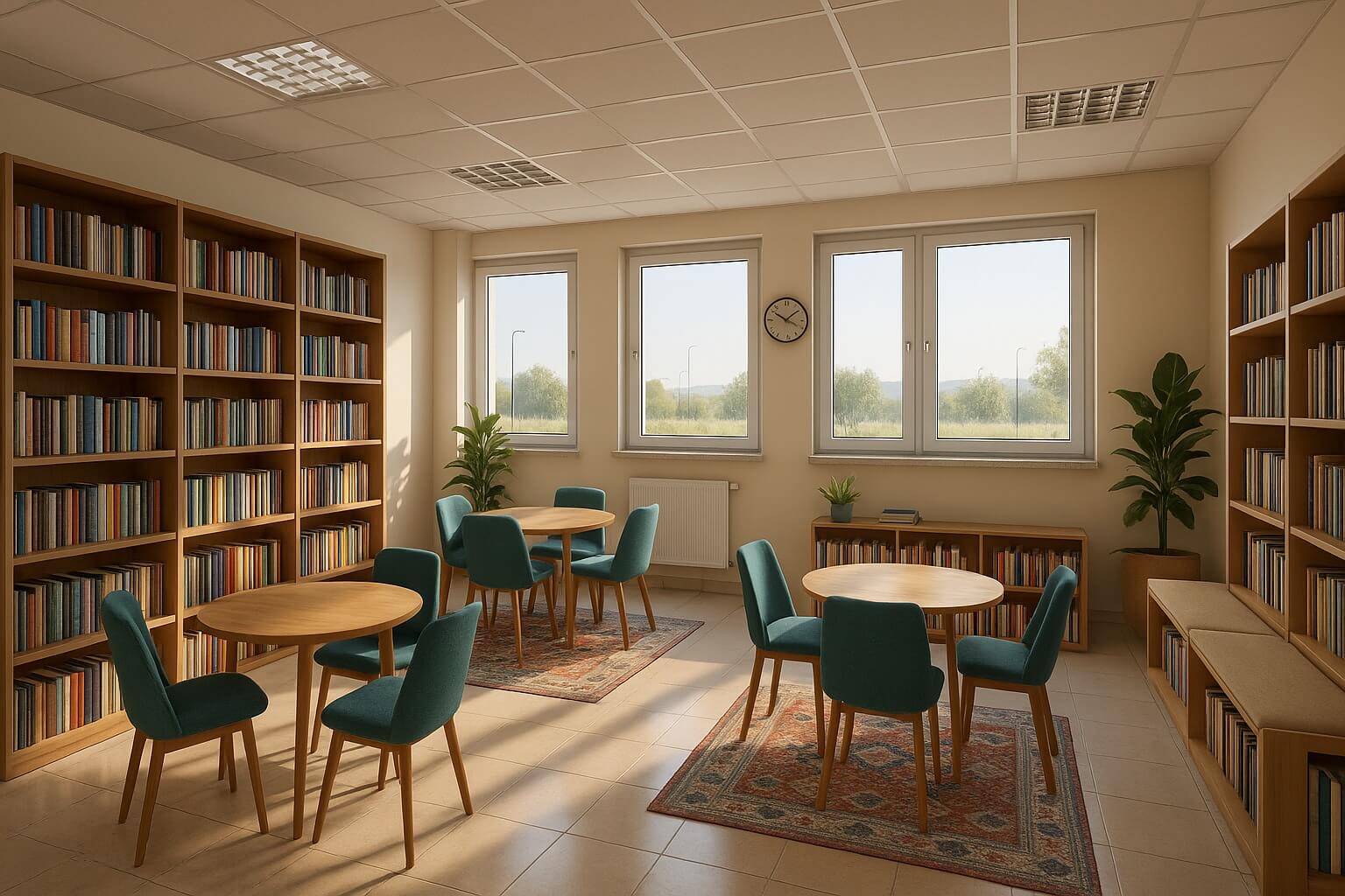 Geniş kütüphane, dinlenme salonu, doğayla iç içe oturma alanları ve sıcak arkadaşlık ortamları.